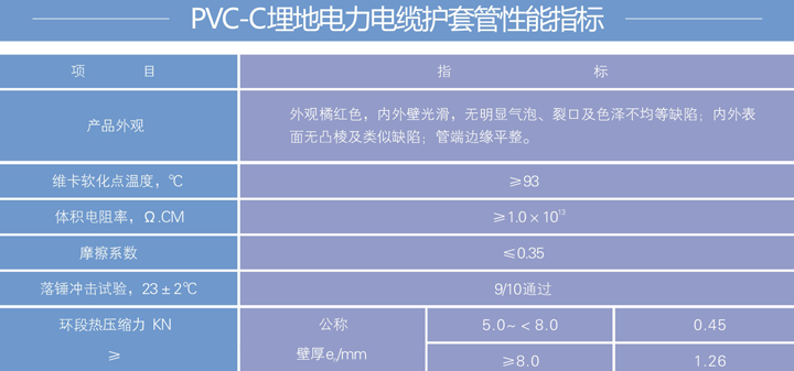 PVC、PVC-C经改性后的一种特殊性能的管材,即以PVC、PVC-C树脂为主要原料,同时加入适量的稳定剂、润滑剂、加工改性剂和抗冲改性剂等,经捏合挤出而成。它与普通PVC管材相比,其维卡软化温度高、抗冲击强度较好、耐老化、抗腐蚀、无污染、阻燃性能好等特点。PVC-C管材安装方便,直接在扩口承插连接处加高温橡胶圈,起防止热胀冷缩的作用,且无需在施工现场浇混凝土及保障层。其自重轻、施工简便,施工费用低,还可大大缩短工期。性能如下: