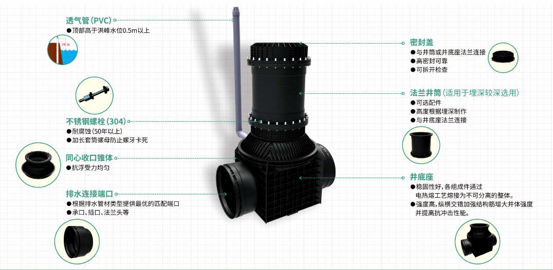 本实用新型密闭性好,解决了检查井影响行洪安全、破坏河道景观的问题,可保证井内外气体压力平衡。本实用新型属于市政工程技术领域,其公开了设置在河道内的密闭污水检查井,包括钢筋混凝土的井体、井盖、支座、螺固件,井盖位于井体上方,井盖与支座采用螺固件连接,支座与井体的钢筋焊接,井体上部设置通气管敷设在河堤上,通气管顶部管口高于洪水位。