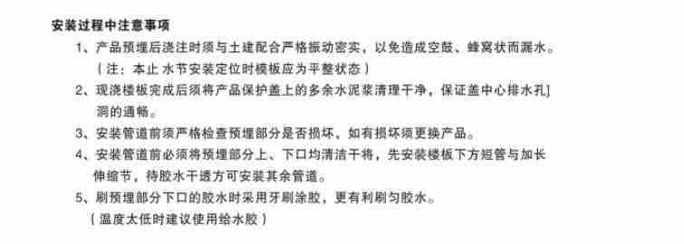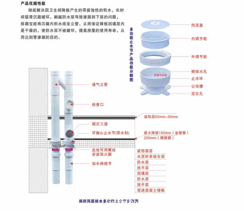 1、自动排漏;2、上下层万向调节;3、预留阻火圈安装位置; 4、与防水材料配合;5、双(多)立管并排预埋接口;6、多重阻水;7、二次排漏
