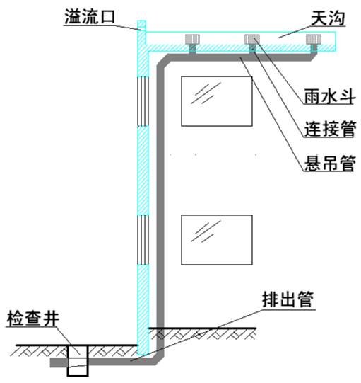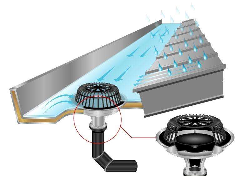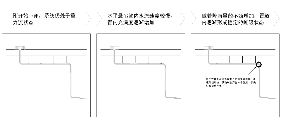 虹吸雨水排放是以雨水在高处所具有的势能为排放动力,依靠独特的雨水斗设计,[当斗前水深达到一定的高度时(32mm-55mm)就可完全实现气水分离],并调节各段管径实现虹吸式雨水的排放。其形成过程经历三种流态,重力流、两相流、满管压力流。在降雨初期,雨水刚刚汇集,雨水斗前水深不大,斗内不能有效阻止空气进入,此时其流态为非满管流,气水逆向流动,此阶段为重力流;随暴雨的发展,雨水越聚越多,斗前水深加大,空气进入的越来越少,管道内形成断断续续的满管流和掺有气泡的满管流——两相流;当斗前水深达到一定高度,不再有空气掺入时,便形成满管压力流态。